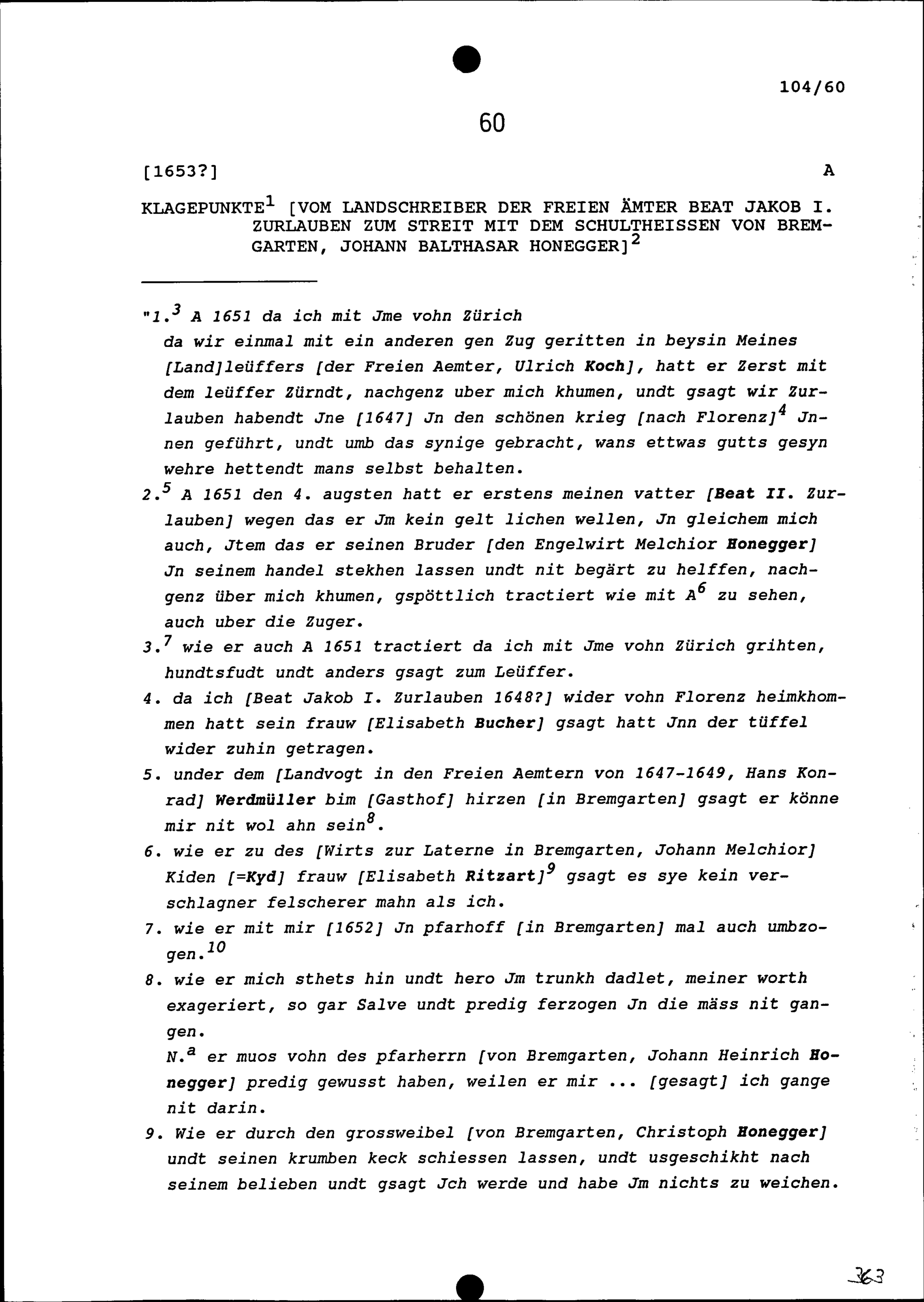 Klagen von Beat Jakob I. Zurlauben, Landschreiber der Freien Ämter, zum Streit mit Johann Balthasar Honegger, Schultheiss von Bremgarten