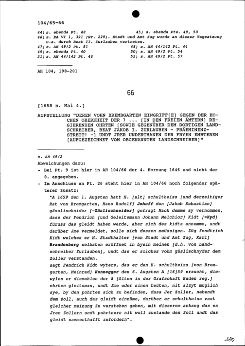 Aufzeichnungen zu den Vorfällen in Bremgarten (Präeminenzstreitigkeit) zwischen dem Landschreiber der Freien Ämter und der Stadt Bremgarten beziehungsweise deren Amtsträgern, aufgezeichnet von Beat Jakob I. Zurlauben, Landschreiber