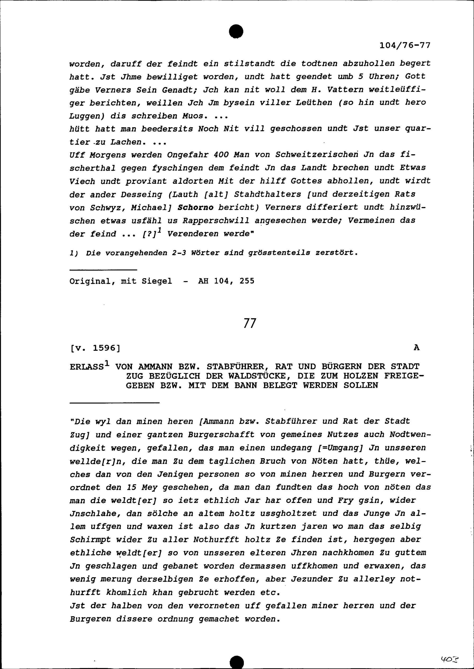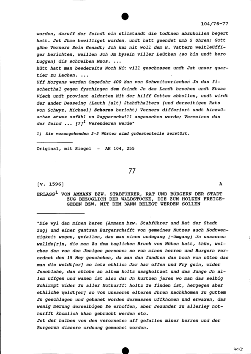 Erlass des Ammanns (Stabführers), Rats und der Bürger der Stadt Zug bezüglich der Waldstücke, die zum Holzen freigegeben beziehungsweise mit dem Bann belegt werden sollen