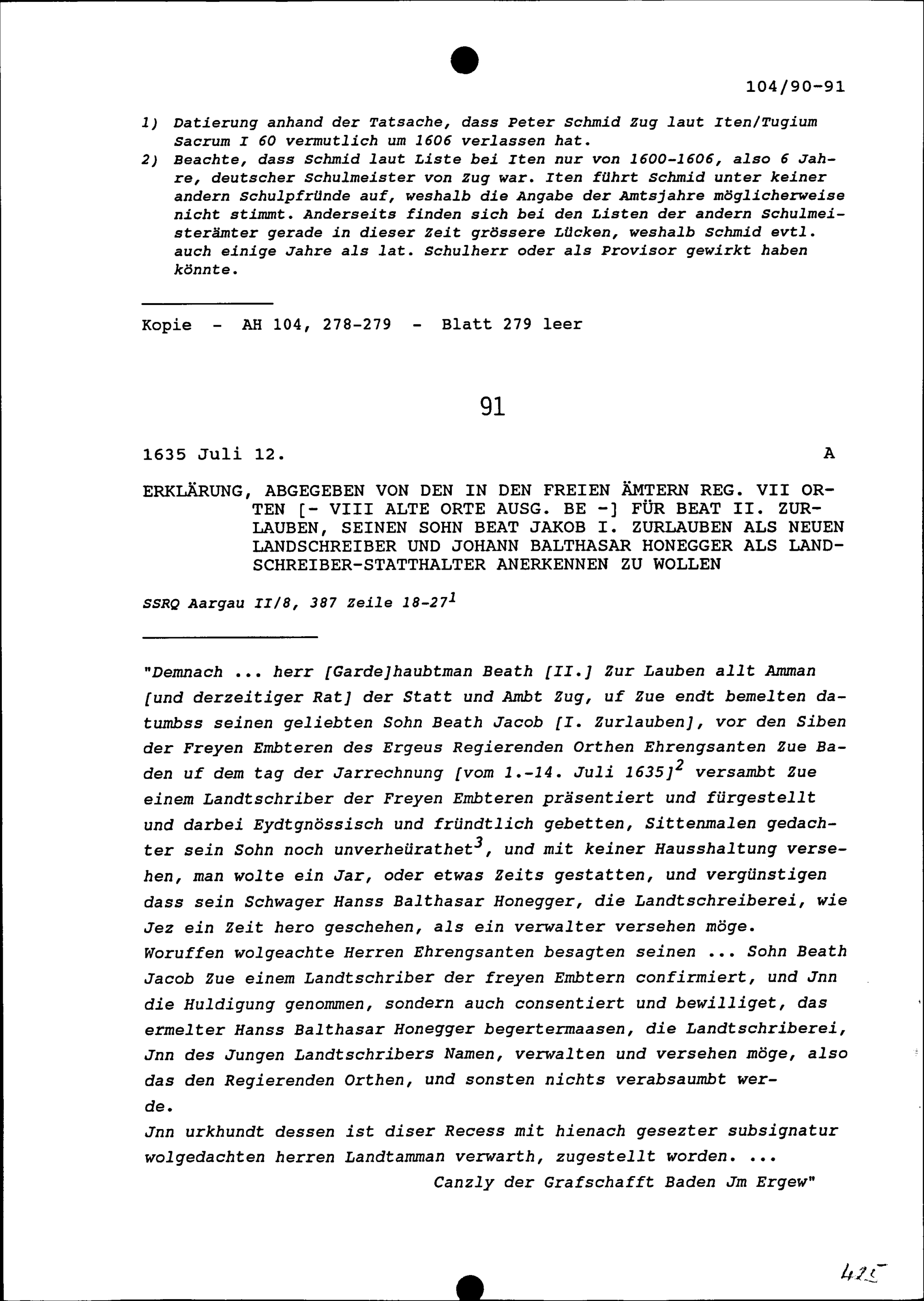 Erklärung, abgegeben von den in den Freien Ämter regierenden Sieben Orten für Beat II. Zurlauben, seinen Sohn Beat Jakob I. Zurlauben als neuen Landschreiber und Johann Balthasar Honegger als Landschreiberstatthalter anerkennen zu wollen