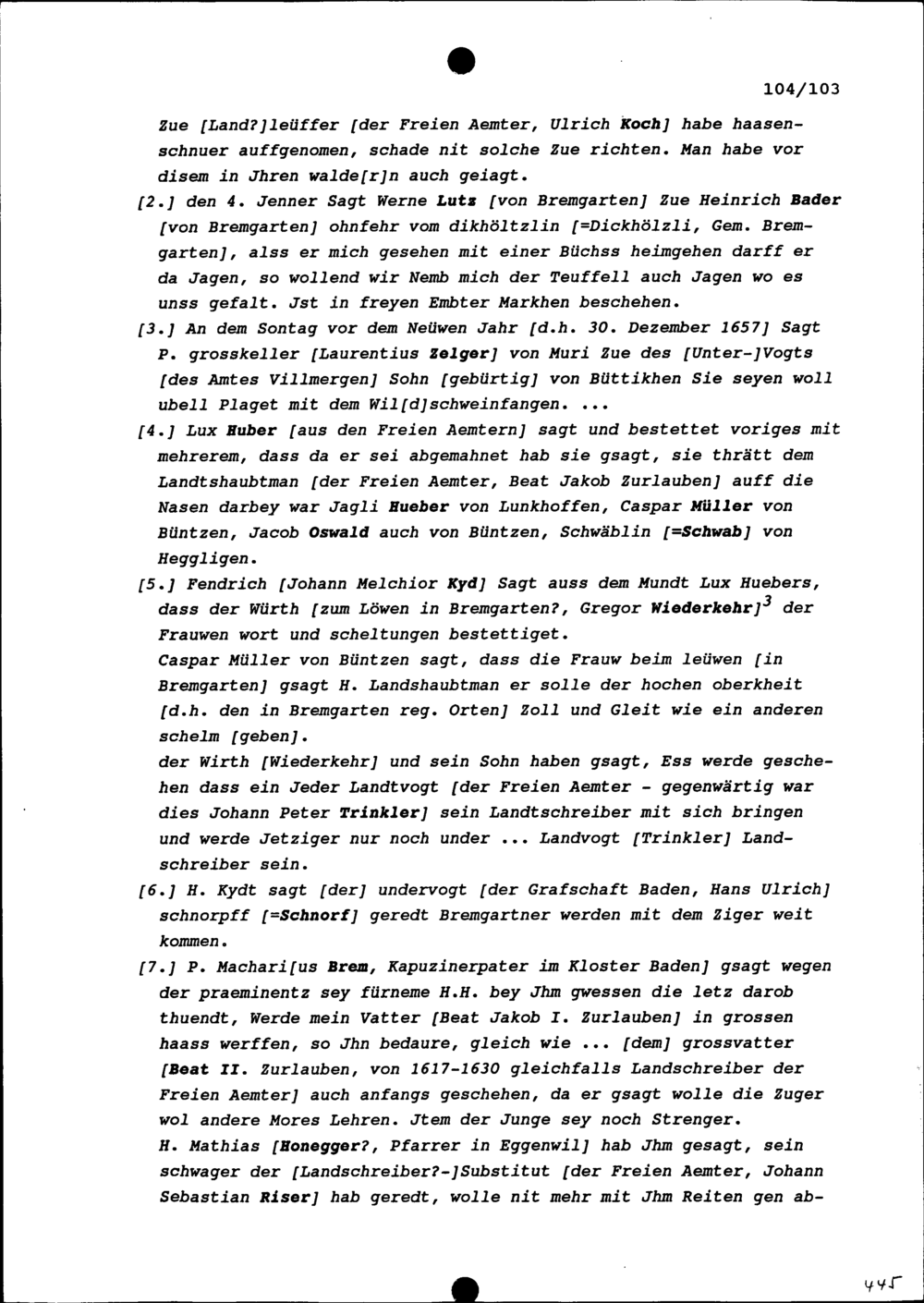 Bericht von Klagen, welche Beat Jakob I. Zurlauben, Landschreiber der Freien Ämter, im sogenannt Präeminenzstreit gegen die Stadt Bremgarten beziehungsweise deren Amtsträger erhob, aufgezeichnet von Heinrich Ludwig Zurlauben