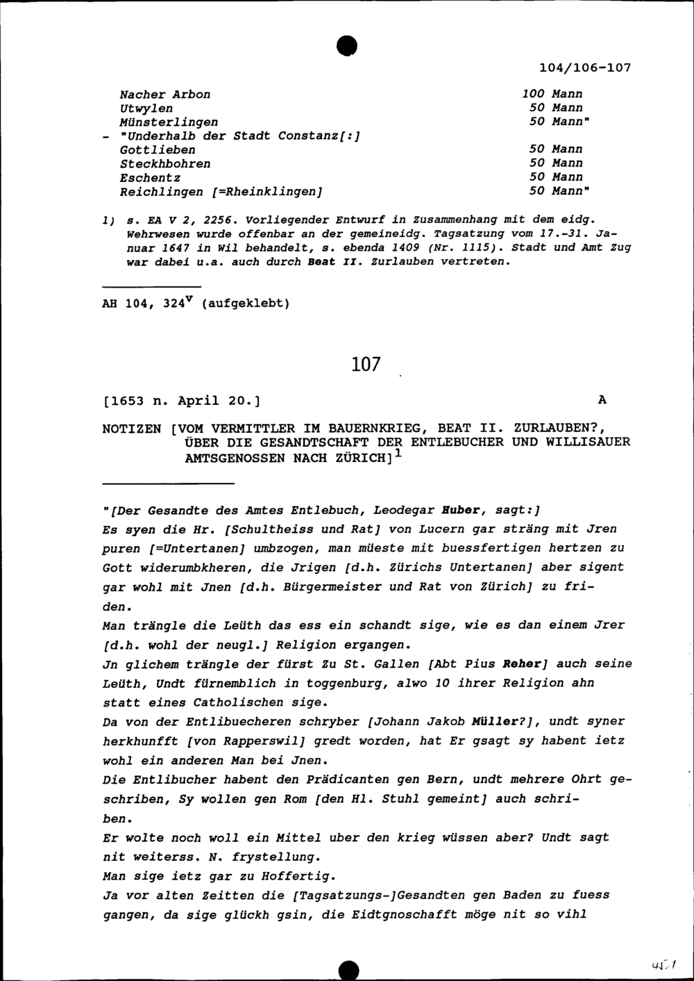 Notiz von Beat II. Zurlauben, Vermittler im Bauernkrieg, über die Gesandtschaft der Entlebucher und Willisauer Amtsgenossen nach Zürich