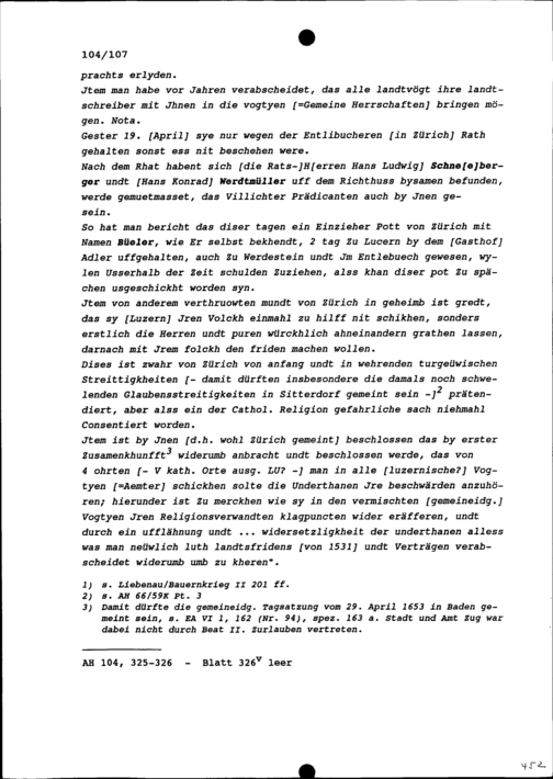 Notiz von Beat II. Zurlauben, Vermittler im Bauernkrieg, über die Gesandtschaft der Entlebucher und Willisauer Amtsgenossen nach Zürich