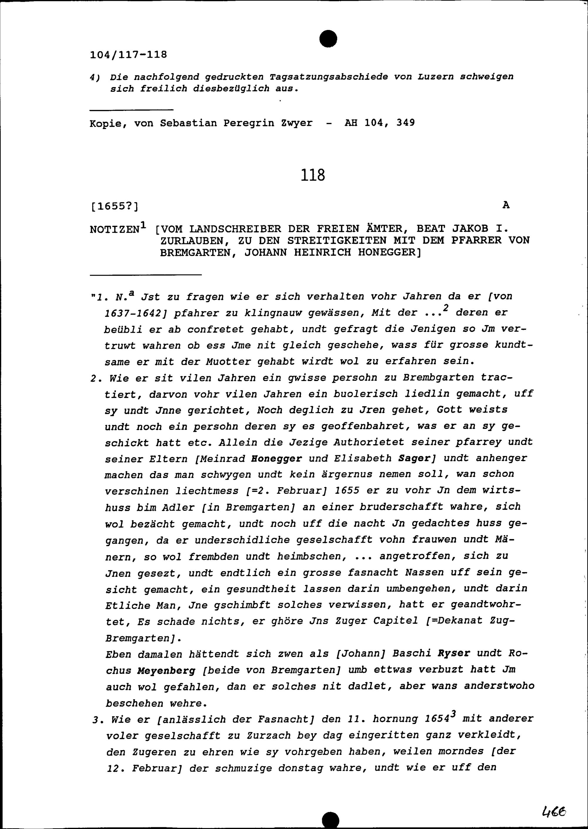Notiz von Beat Jakob I. Zurlauben, Landschreiber der Freien Ämter, zu den Streitigkeiten mit Johann Heinrich Honegger, Pfarrer von Bremgarten