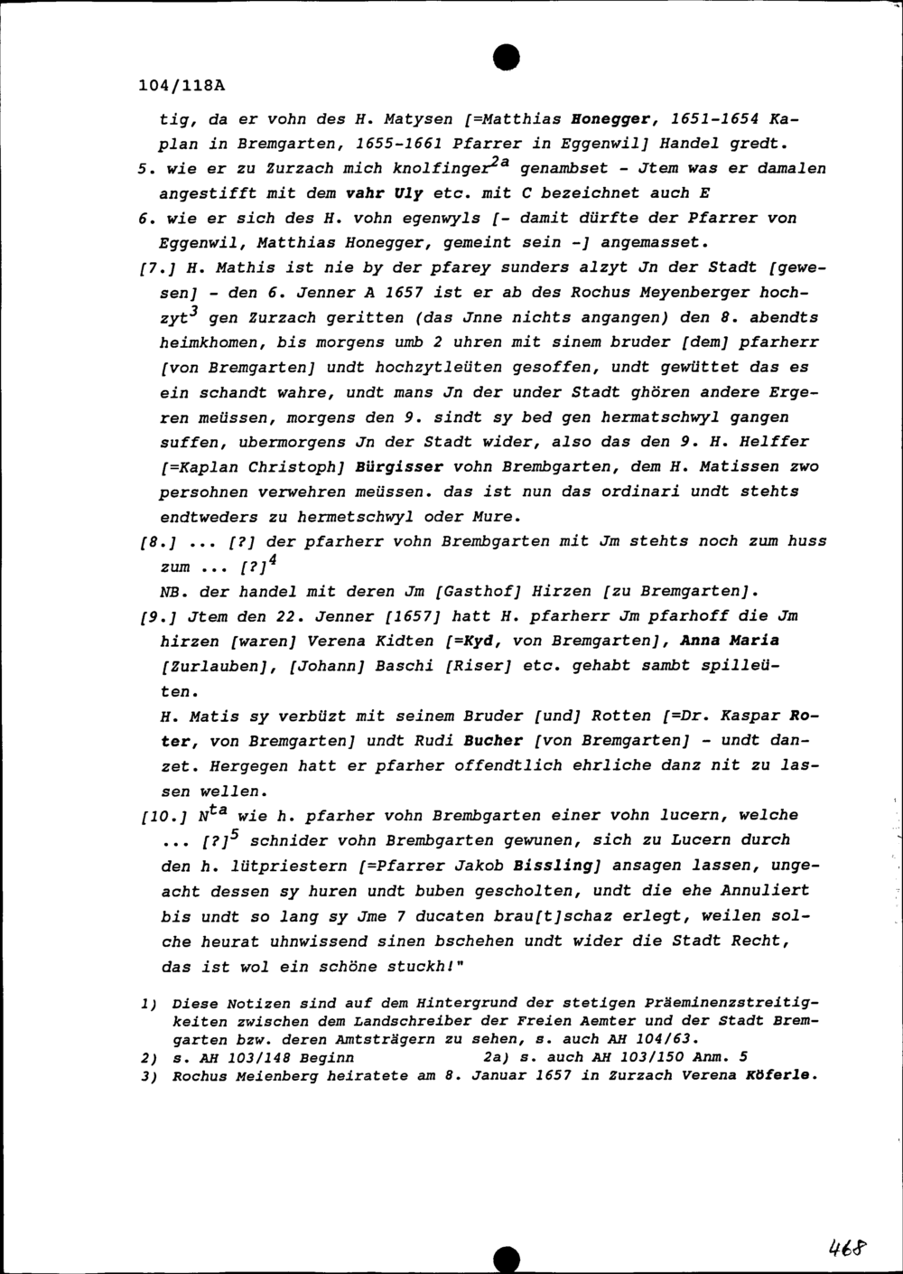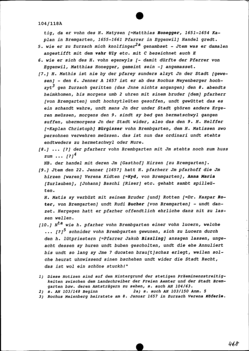 Notiz von Beat Jakob I. Zurlauben, Landschreiber der Freien Ämter, zu den Streitigkeiten mit Johann Heinrich Honegger, Pfarrer von Bremgarten