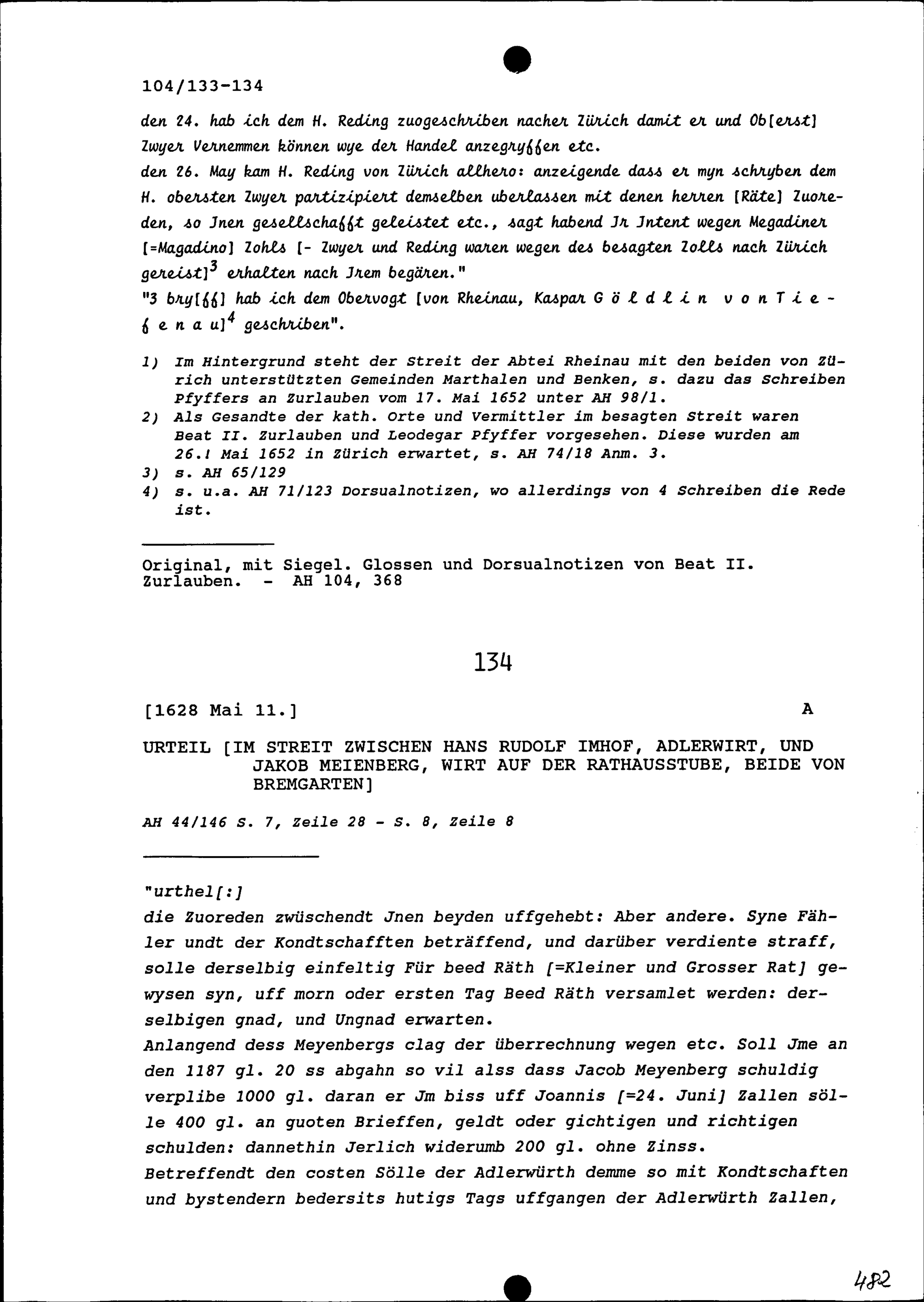 Urteil im Streit zwischen Hans Rudolf Imhof, Adlerwirt, und Jakob Meienberg, Wirt auf der Rathausstube, beide von Bremgarten