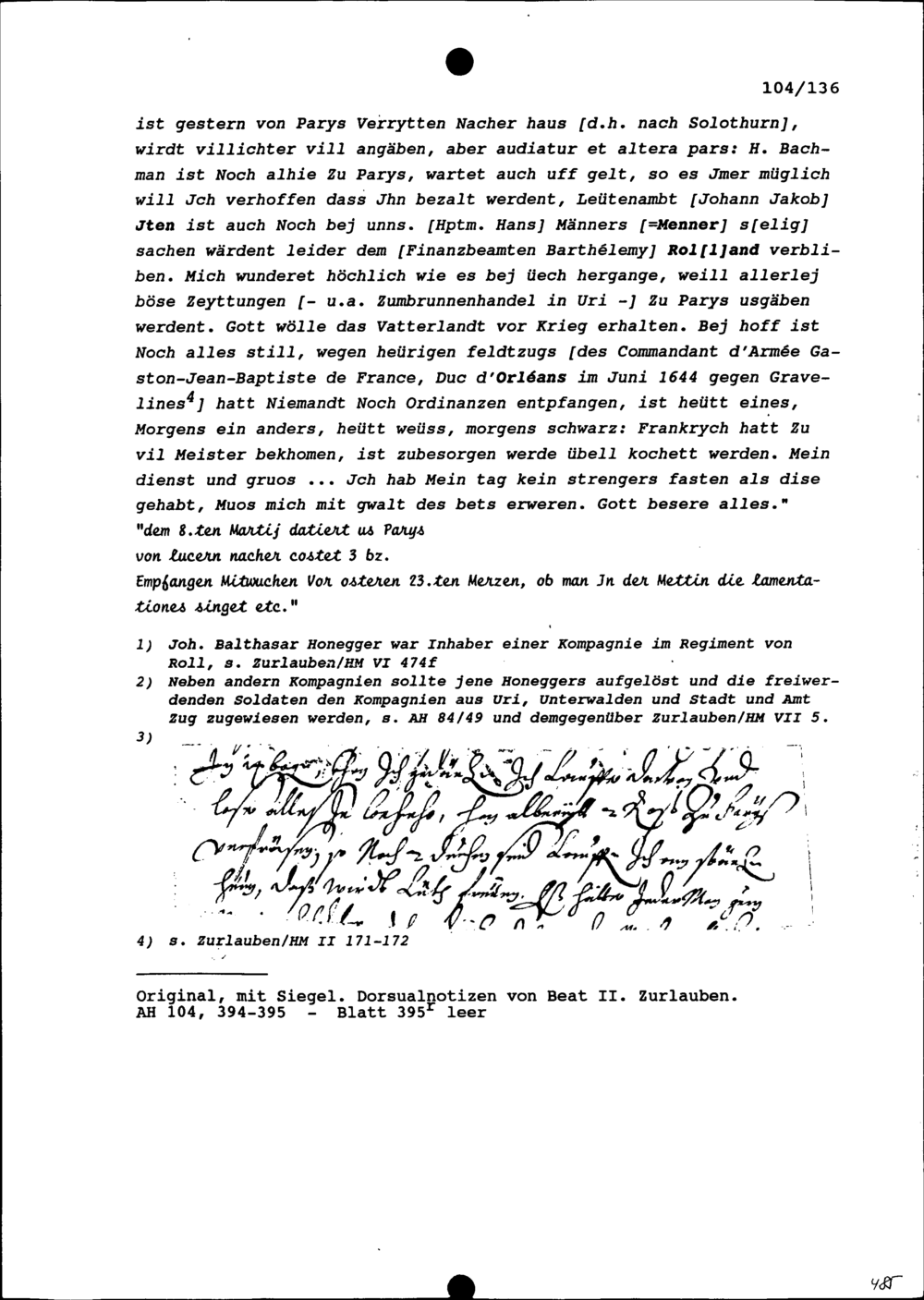 Schreiben von Johann Balthasar Honegger, Hauptmann, an Beat II. Zurlauben, Ammann, Zug