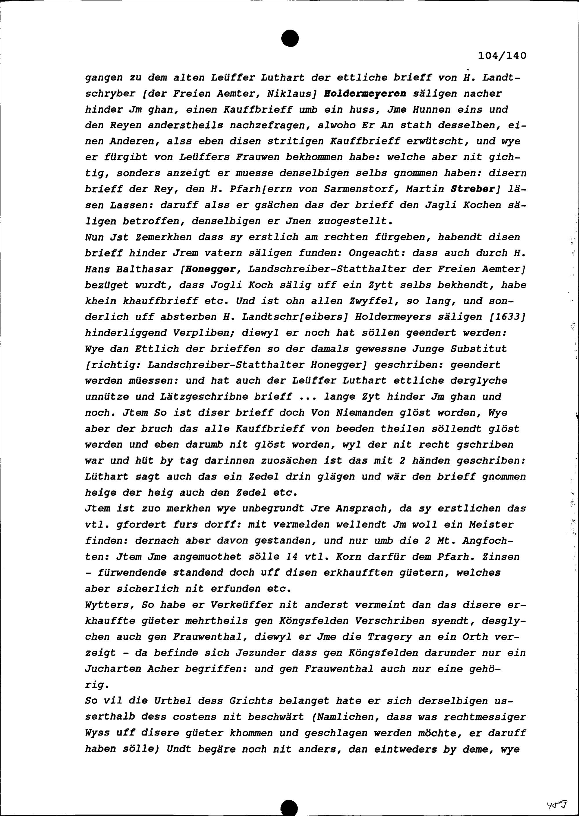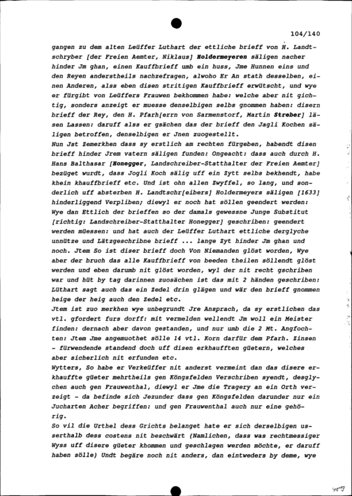 Bericht über die Streitigkeiten zwischen Jakob Hunn, Sarmenstorfer Dorfgenosse, als Käufer und Jakob Koch, Sarmenstorfer Dorfgenosse, beziehungsweise dessen Erben als Verkäufer wegen eines 1633 zu Sarmenstorf erfolgten Güterkaufs