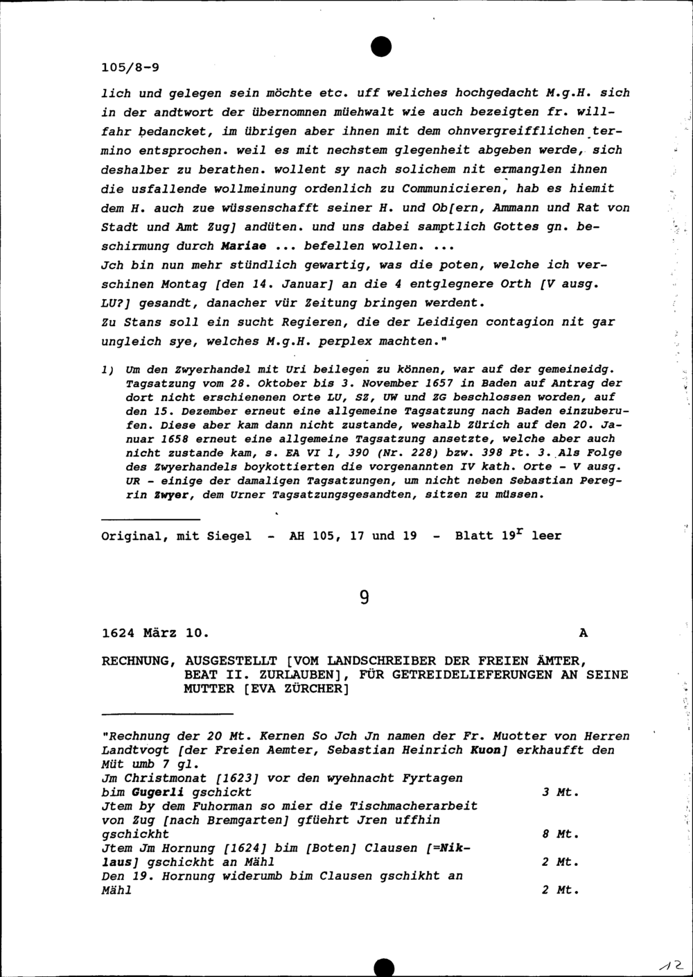Rechnung für Getreidelieferungen an Eva Zürcher, seine Mutter, ausgestellt von Beat II. Zurlauben, Landschreiber der Freien Ämter