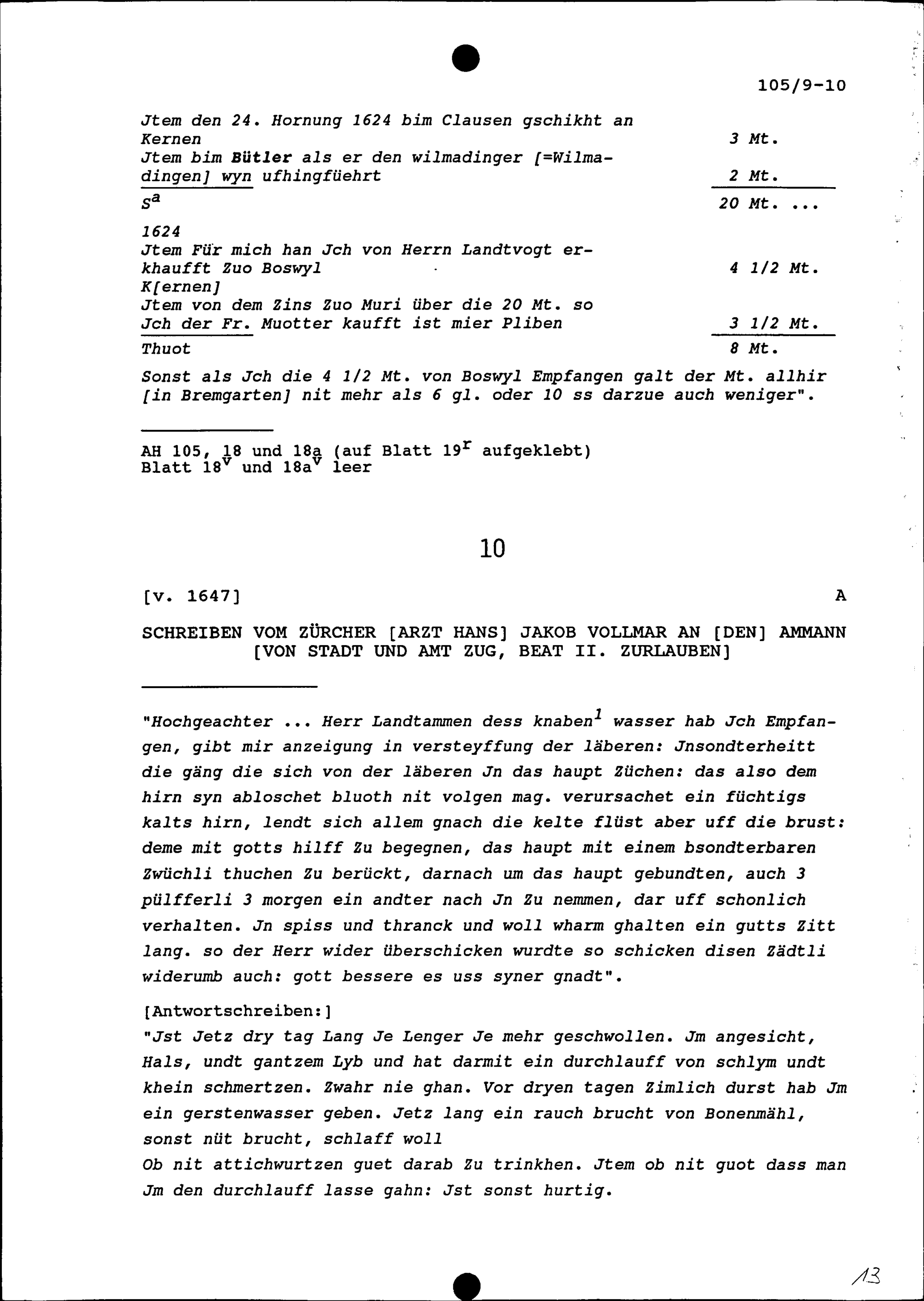 Schreiben von Hans Jakob Vollmar, Zürcher Arzt, an Beat II. Zurlauben, Ammann von Stadt und Amt Zug,