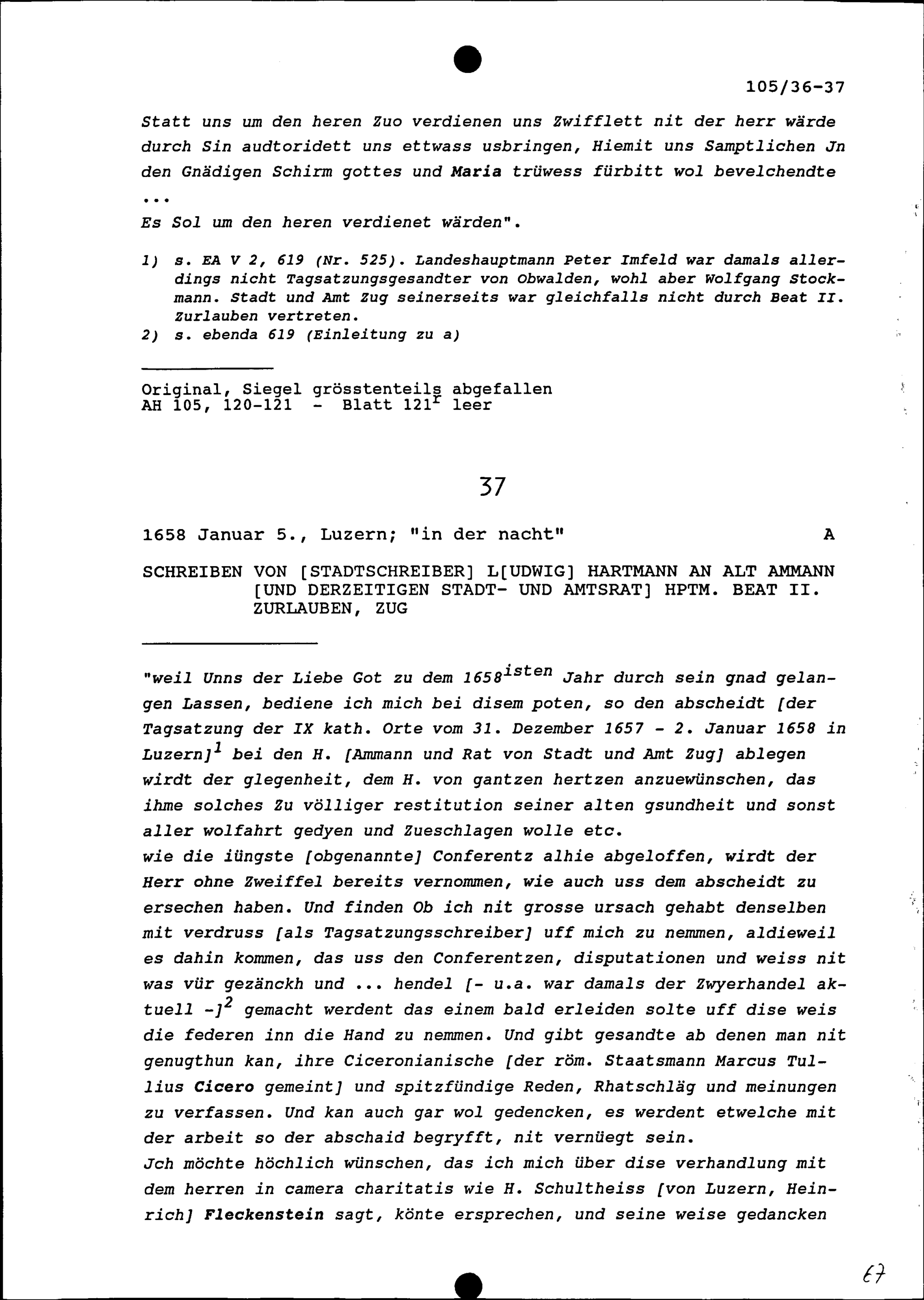 Schreiben von Ludwig Hartmann, Stadtschreiber, an Beat II. Zurlauben, Hauptmann und Stadt- und Amtrat, Zug