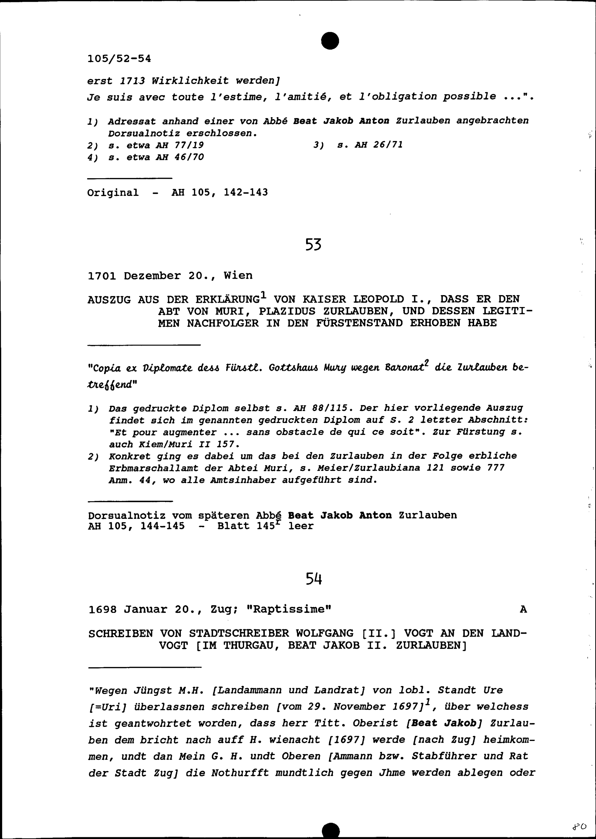 Erklärung von Leopold I., Kaiser des Heiligen Römischen Reiches, dass er Plazidus Zurlauben, Abt von Muri, und dessen Nachfolger in den Fürstenstand erhoben habe