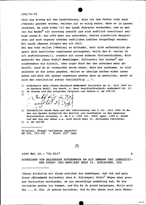 Schreiben von Balthasar Aufdermaur an Beat II. Zurlauben, Altammann und Stadt- und...