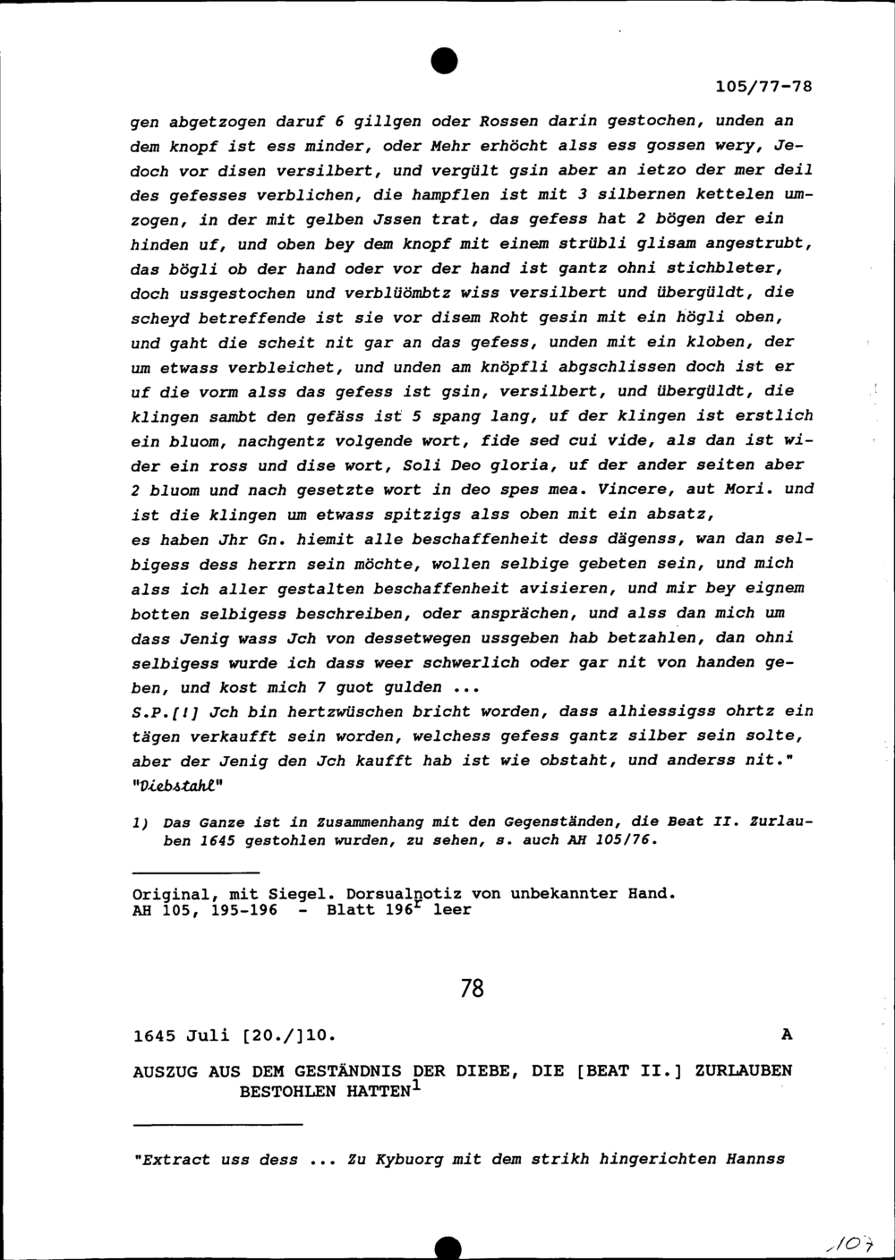 Geständnis der Diebe, die Beat II. Zurlauben bestohlen hatten