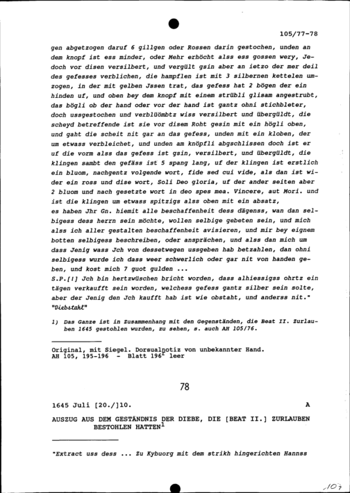 Geständnis der Diebe, die Beat II. Zurlauben bestohlen hatten (Auszug)