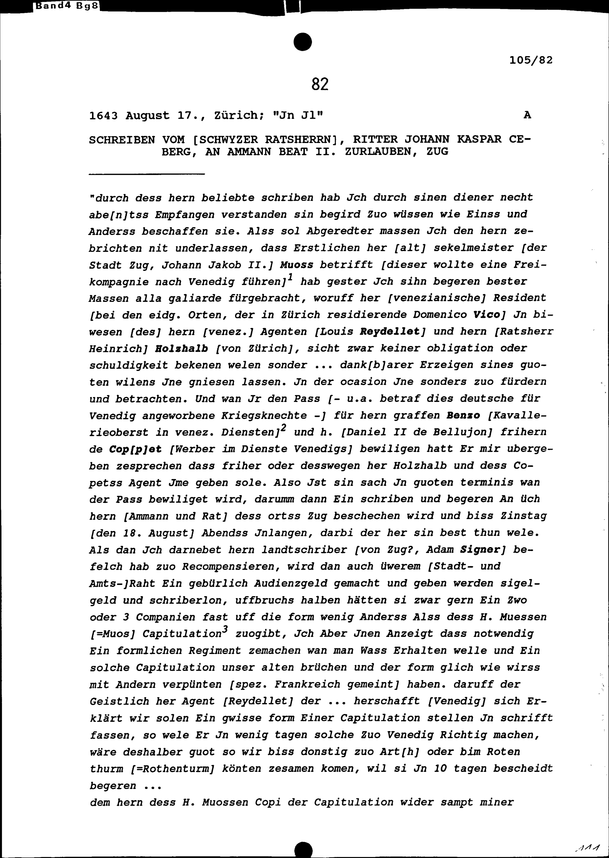 Schreiben von Johann Kaspar Ceberg, Ratsherr Schwyz, an Beat II. Zurlauben, Ammann, Zug