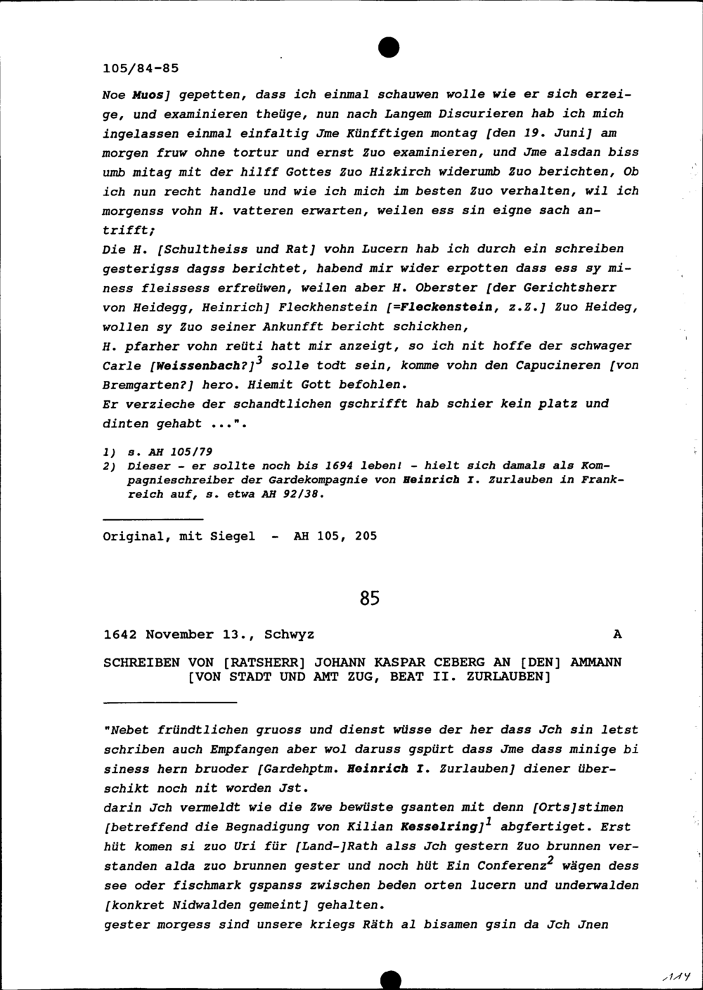 Schreiben von Johann Kaspar Ceberg, Ratsherr, an Beat II. Zurlauben, Ammann von Stadt und Amt Zug,