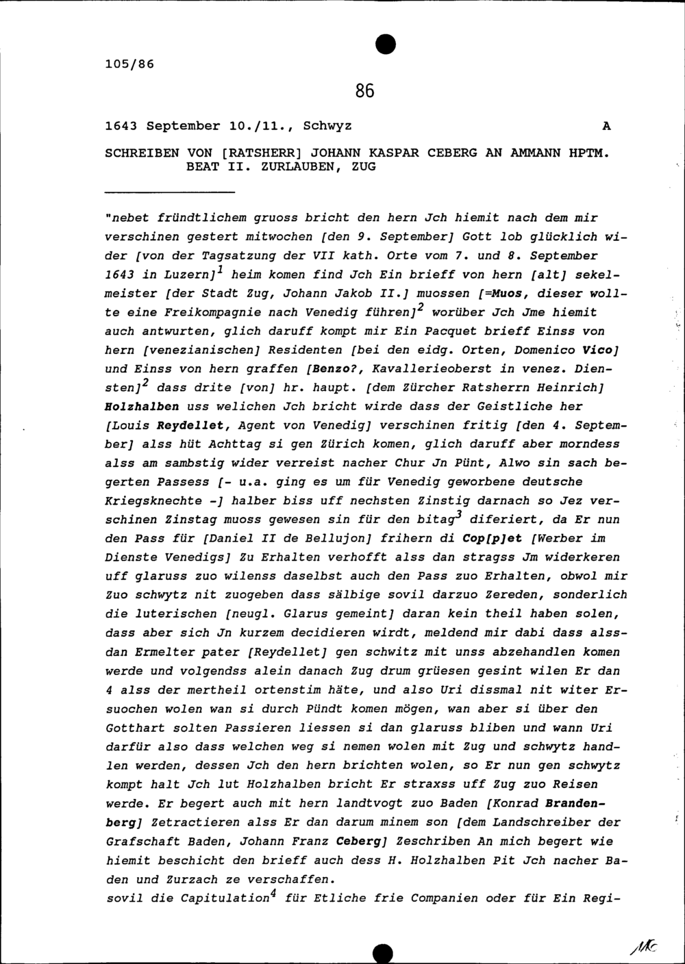 Schreiben von Johann Kaspar Ceberg, Ratsherr, an Beat II. Zurlauben, Ammann und Hauptmann, Zug