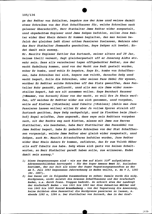 Zeugenaussagen in einem Streit zwischen der Stadt Schaffhausen und Johann Heinrich Schaufelbühl, Zurzacher Statthalter, wegen begangener Grenzverletzungen