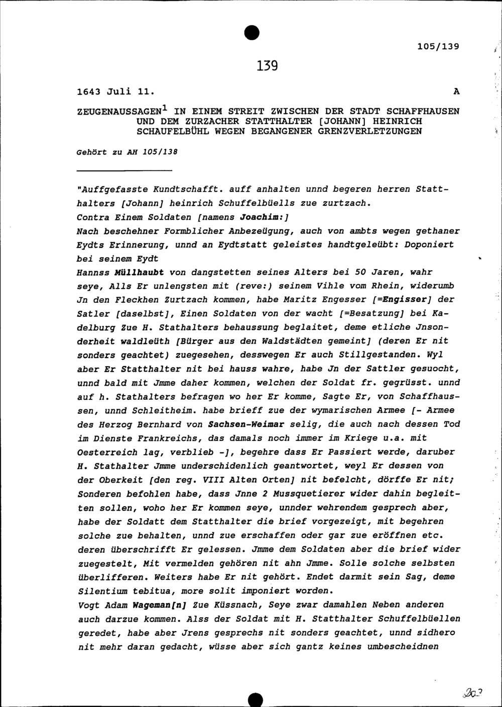 Zeugenaussagen in einem Streit zwischen der Stadt Schaffhausen und Johann Heinrich Schaufelbühl, Zurzacher Statthalter, wegen begangener Grenzverletzungen
