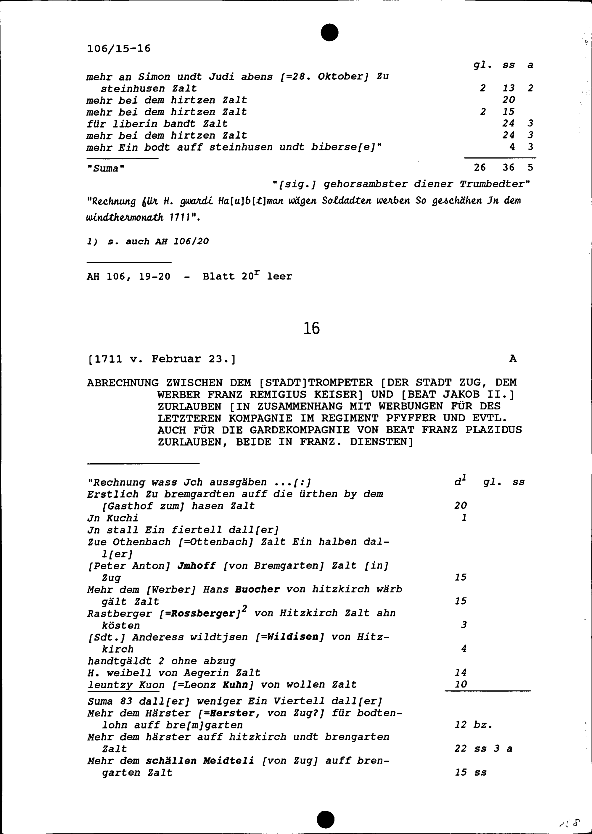 Abrechnung zwischen Franz Remigius Keiser, Stadttrompeter und Werber, von Zug, und Beat Jakob II. Zurlauben in Zusammenhang mit Werbungen für sine Kompanie im Regiment Pfyffer und die Gardekompanie von Beat Franz Plazidus Zurlauben, beide in französischen Diensten