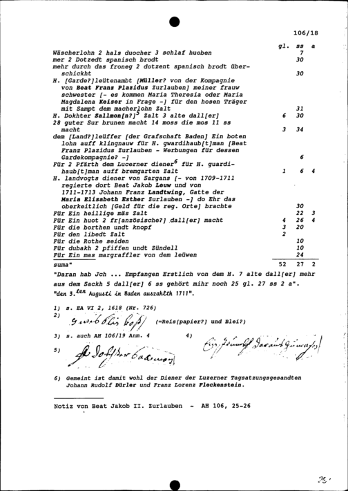 Abrechnung zwischen Franz Remigius Keiser, Stadttrompeter und Werber, von Zug, und Beat Jakob II. Zurlauben, Altammann und Tagsatzungsgesandter von Stadt und Amt Zug auf der am 5. Juli 1711 in Baden begonnenen Jahrrechnung