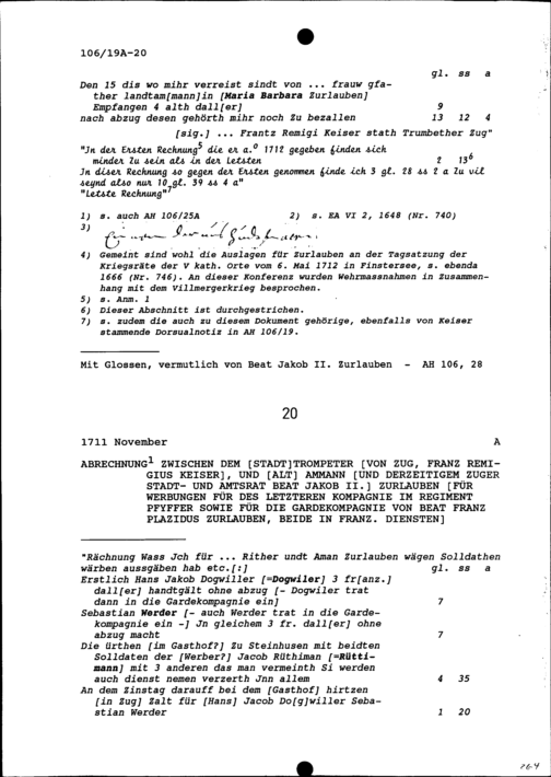 Abrechnung zwischen Franz Remigius Keiser, Stadttrompeter und Werber, von Zug, und Beat Jakob II. Zurlauben, Altammann und Stadt- und Amtrat Zug, für Werbungen für seine Kompanie im Regiment Pfyffer und die Gardekompanie von Beat Franz Plazidus Zurlauben, beide in französischen Diensten