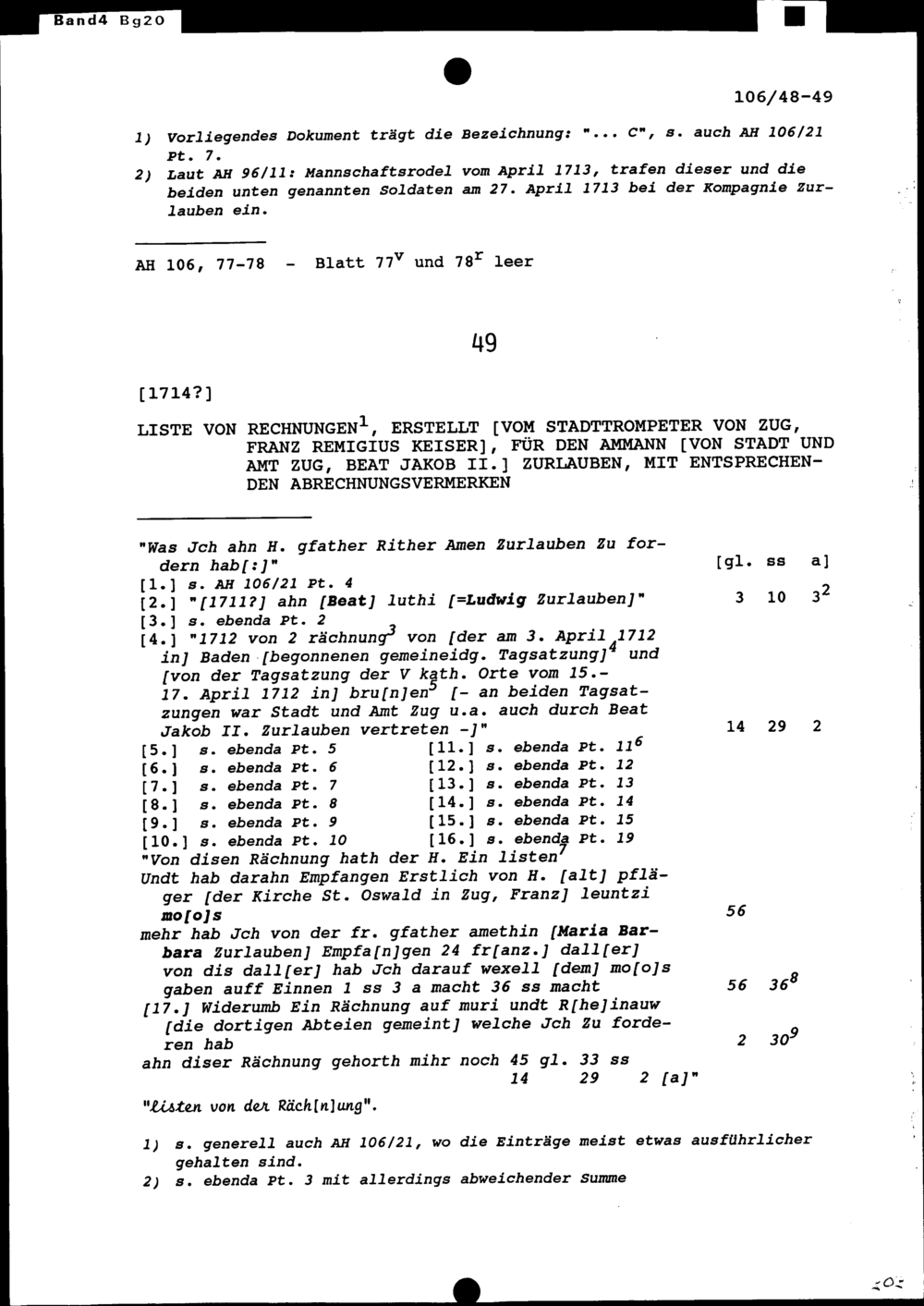 Rechnungen, erstellt von Franz Remigius Keiser, Stadttrompeter und Werber, von Zug, für Beat Jakob II. Zurlauben, Ammann von Stadt und Amt Zug