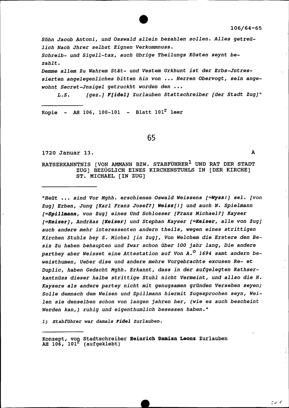 Ratsbeschluss des Ammanns (Stabführers) und Rats der Stadt Zug bezüglich eines Kirchenstuhls in der Kirche Sankt Michael in Zug