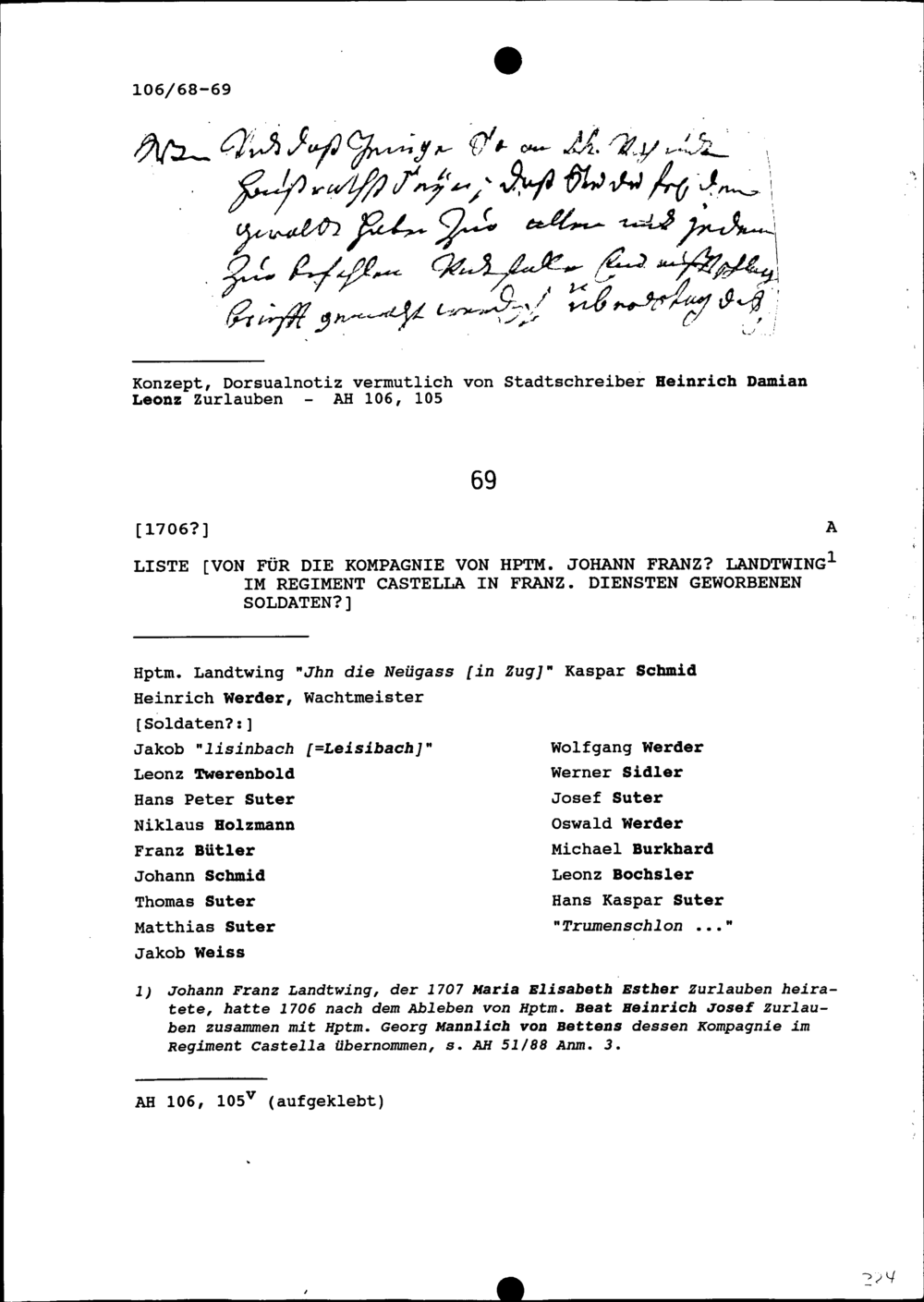 Liste von für die Kompanie von Johann Franz Landtwing, Hauptmann, im Regiment Castella in französischen Diensten geworbenen Soldaten