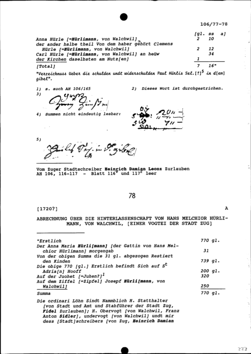 Abrechnung über die Hinterlassenschaft von Hans Melchior Hürlimann, von Walchwil