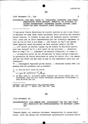 Bittgesuch von Beat Jakob II. Zurlauben zuhanden von Roger Brûlart, Marquis de Puysieux, Ambassador von Frankreich, in Sachen Forderungen gegenüber seinen Vettern Beat Jakob Zurlauben und Beat Heinrich Josef Zurlauben