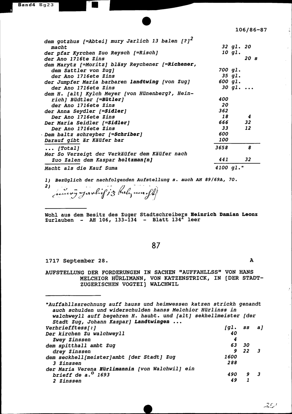 Aufstellung der Forderungen in Sachen Konkurs (Auffall) von Hans Melchior Hürlimann, von Katzenstrick, Walchwil