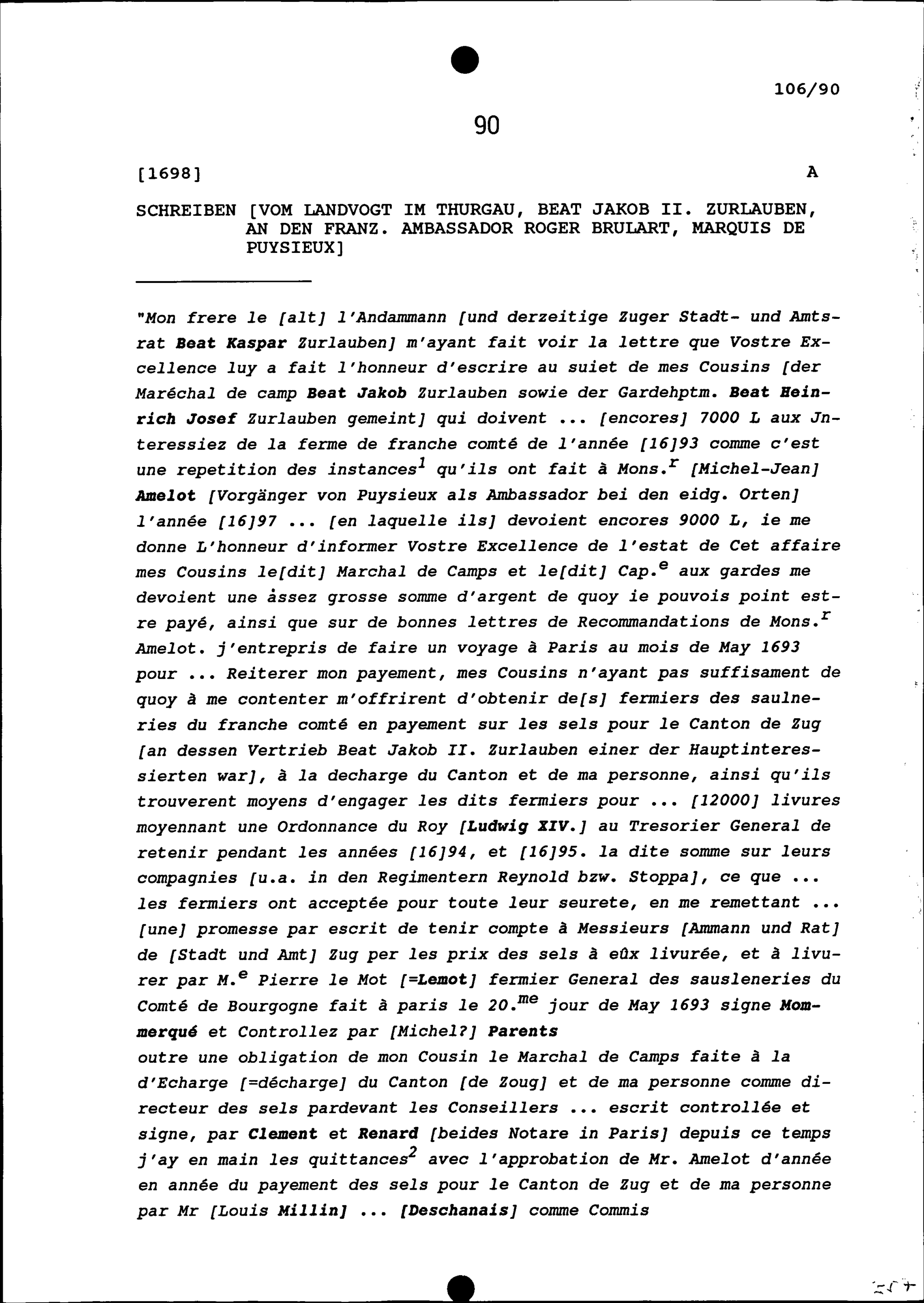 Schreiben von Beat Jakob II. Zurlauben, Landvogt im Thurgau, an Roger Brûlart, Marquis de Puysieux, Ambassador von Frankreich