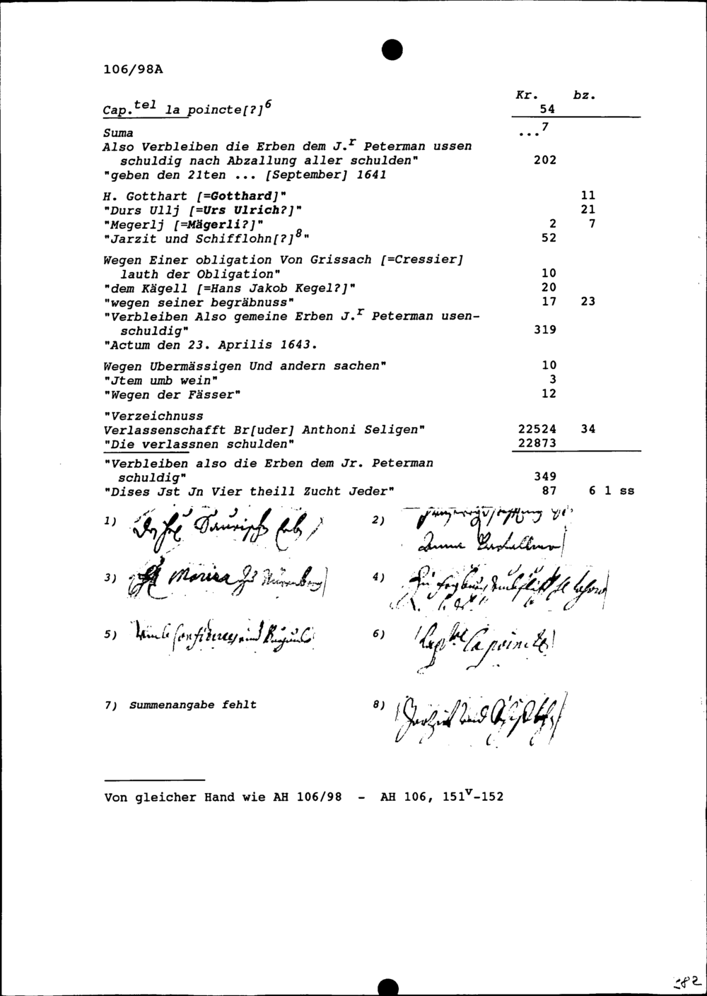 Verzeichnis der Schulden von Petermann Waller, der Bruder von Anna Elisabeth Wallier, Gattin von Heinrich I. Zurlauben, wegen Anton Wallier, ihrem Bruder, von Solothurn