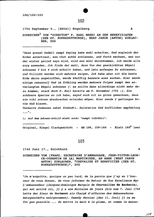 Schreiben von Karl Breni, Konventuale, an Beat Jakob Anton Zurlauben, Priester und Benefiziat der Sankt Konradspfrund, Zug