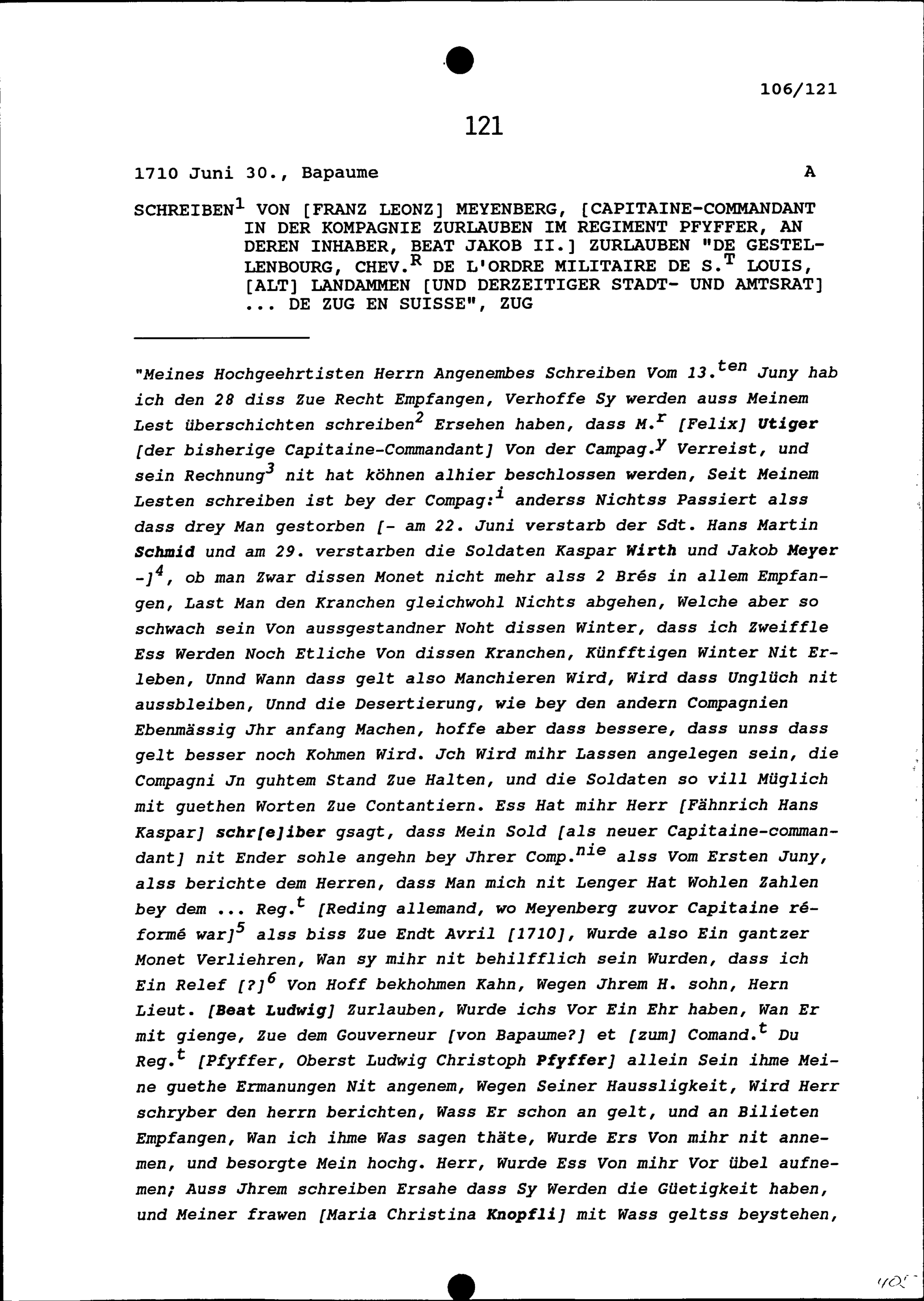 Schreiben von Franz Leonz Meyenberg, Kommandant in der Kompanie Zurlauben im Regiment...