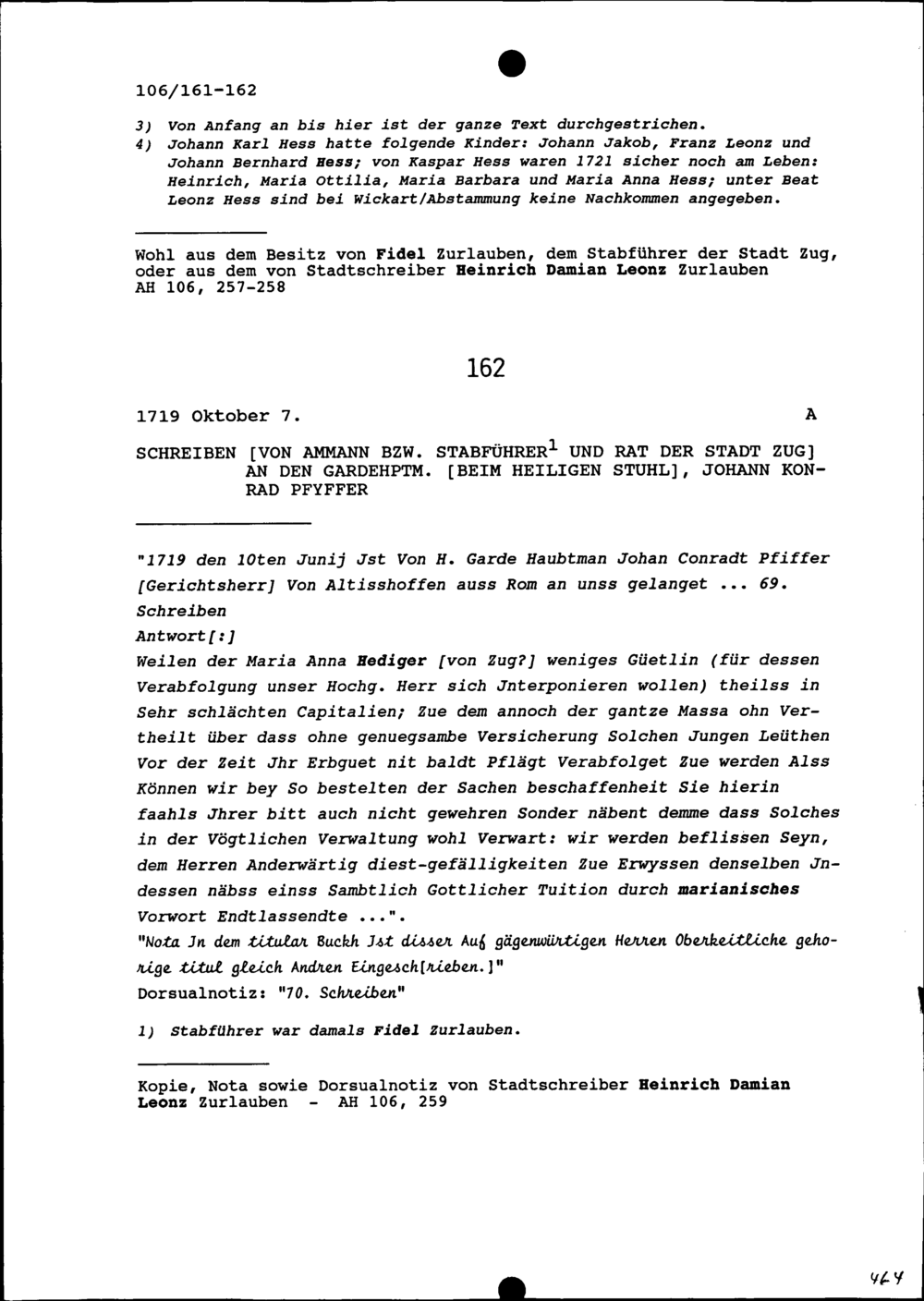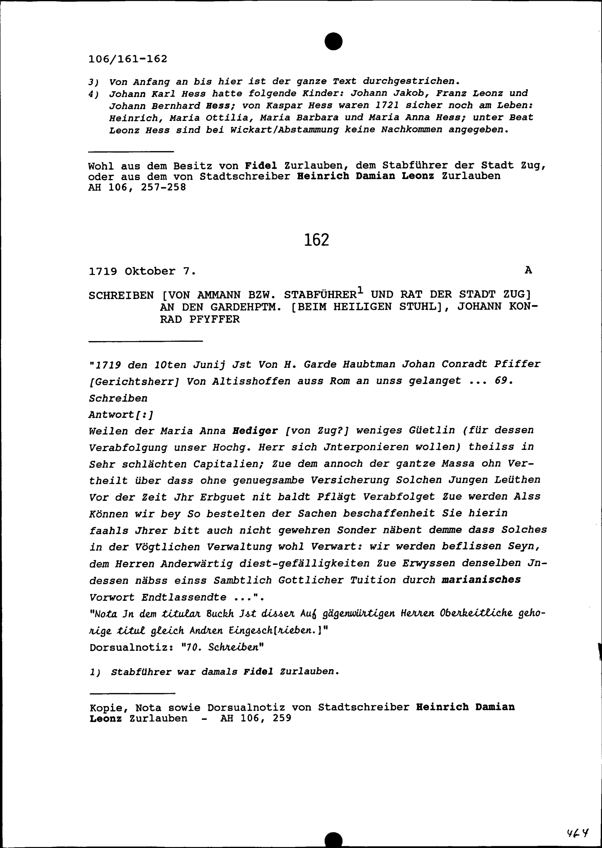 Schreiben des Ammanns (Stabführers) und Rats der Stadt Zug an Johann Konrad Pfyffer, Gardehauptmann beim Heiligen Stuhl