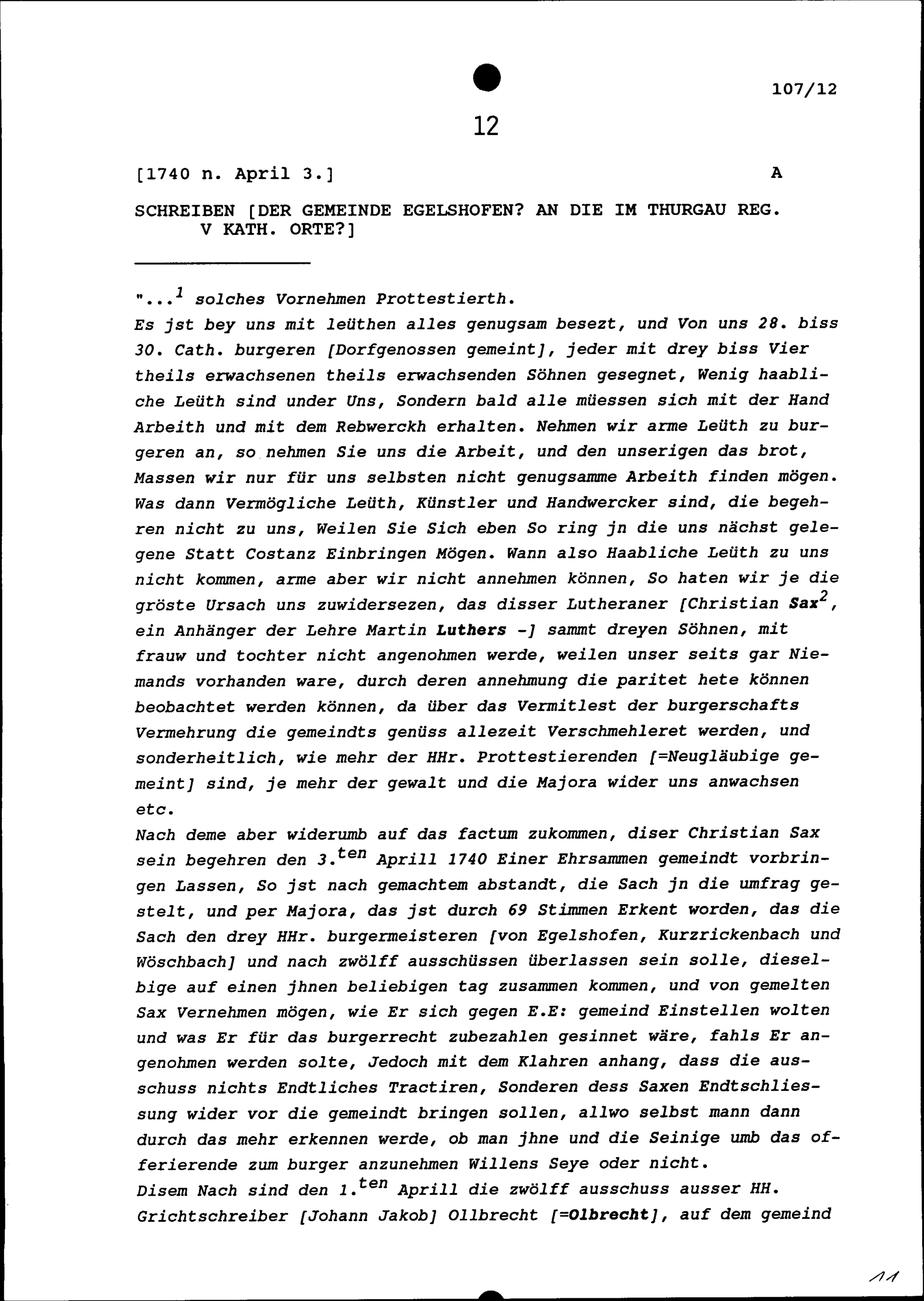 Schreiben der Gemeinde Egelshofen an die im Thurgau regierenden Fünf Katholischen Orte