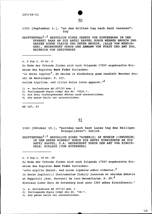 Kaufvertrag bezüglich eines Zehnts von Hinterburg in der Pfarrei Baar an die Abtei Kappel durch Werner Bruhin und durch Ulrich Bruhin und durch Peter Bruhin, seine Söhne, alle von Menzingen, beurkundet von Heinrich von Greifensee, Ammann von Stadt und Amt Zug