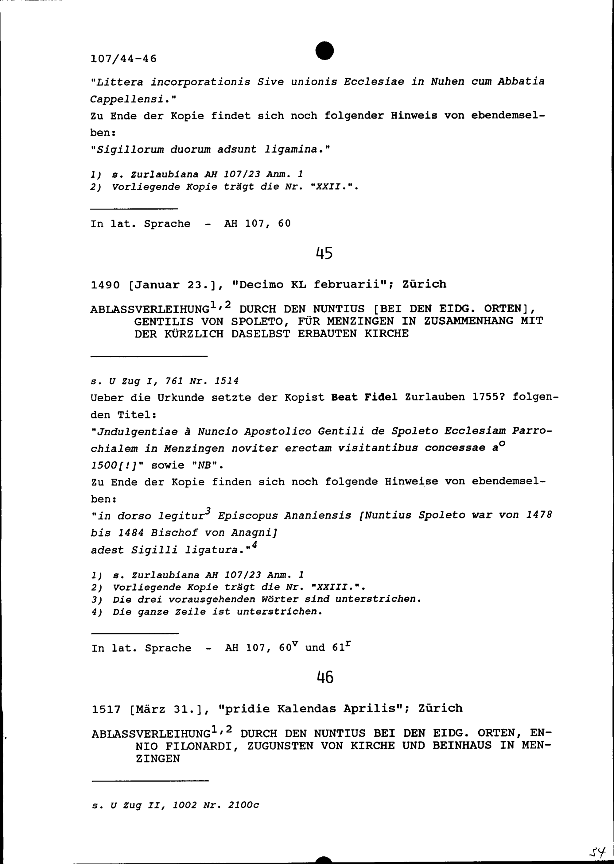 Ablassverleihung durch Gentilis von Spoleto, Nuntius bei den Eidgenössischen Orten, für Menzingen in Zusammenhang mit der kürzlich erbauten Kirche