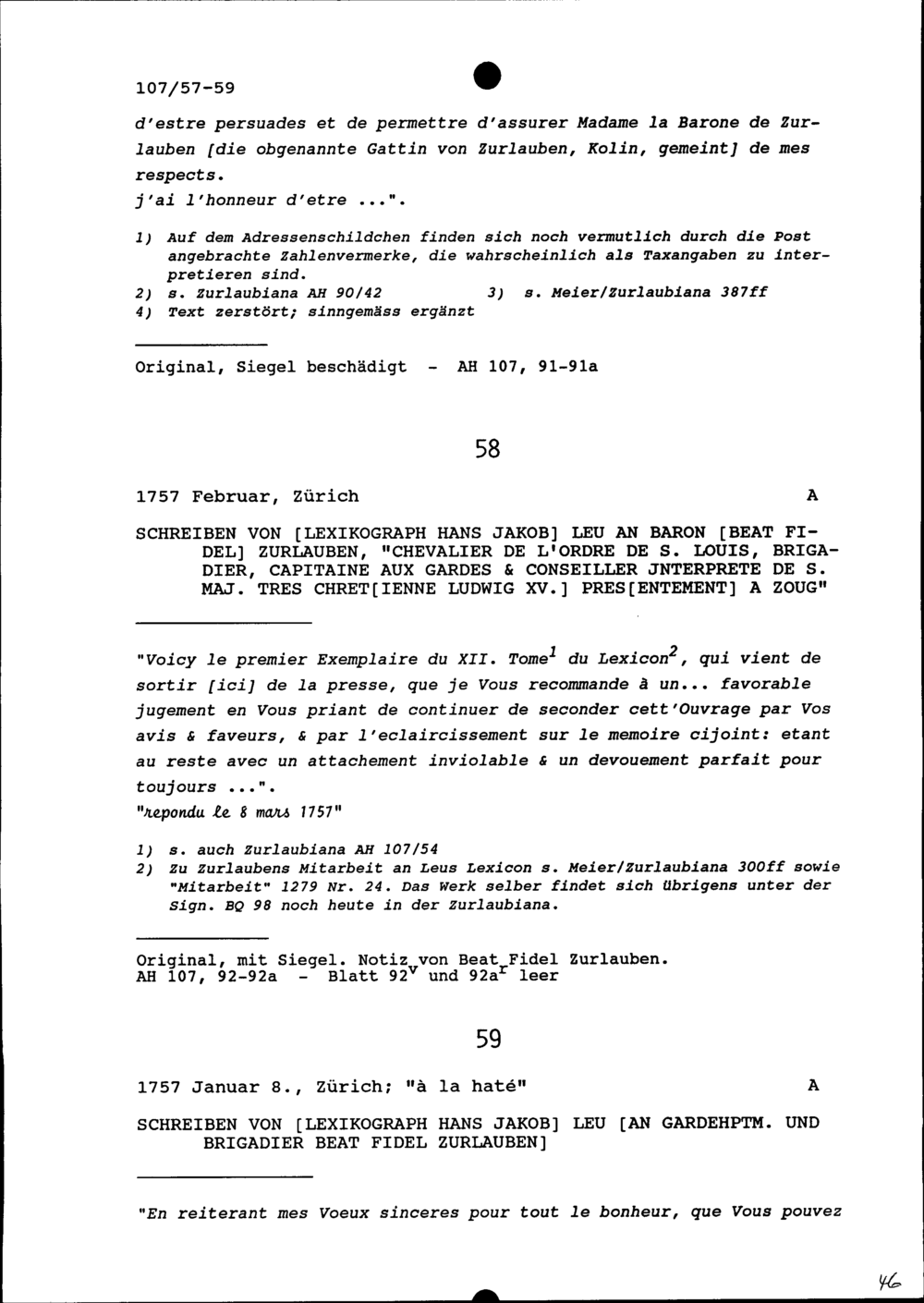 Schreiben von Hans Jakob Leu, Lexikograph, an Beat Fidel Zurlauben, Brigadier, Zug