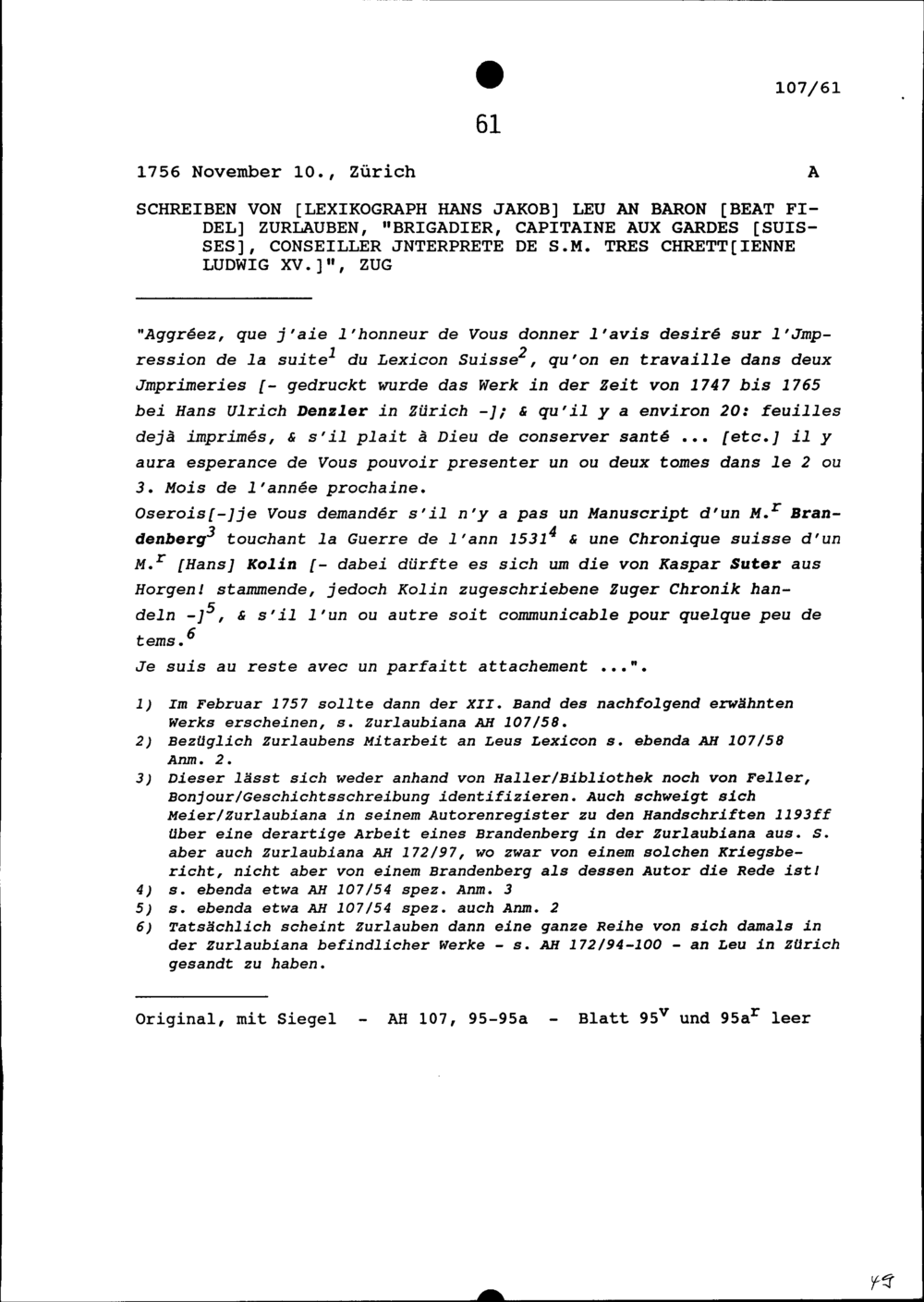 Schreiben von Hans Jakob Leu, Lexikograph, an Beat Fidel Zurlauben, Brigadier, Zug