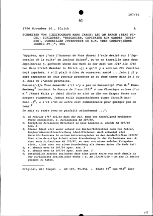 Schreiben von Hans Jakob Leu, Lexikograph, an Beat Fidel Zurlauben, Brigadier, Z...