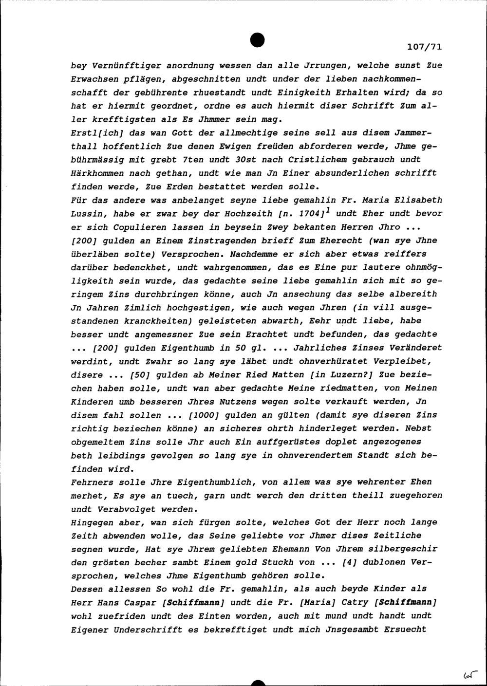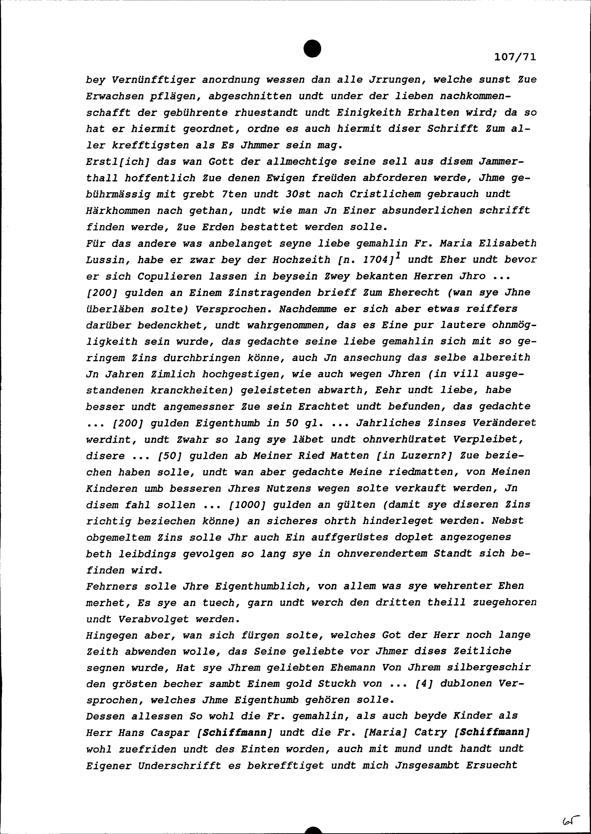 Testament von Hans Kaspar Schiffmann, von Luzern, zugunsten seiner Gattin Maria Elisabeth Lussi