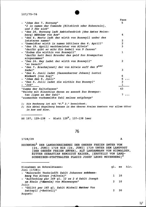 Rechnung der Landschreiberei der Oberen Freien Ämter vom 24. Juni 1728 bis 24. Juni 1729 unter Sebastian Remigius Kaiser, Landvogt der Oberen Freien Ämter und Altlandammann von Nidwalden, erstellt von Plazid Josef Leonz Meyenberg, Landschreiberstatthalter