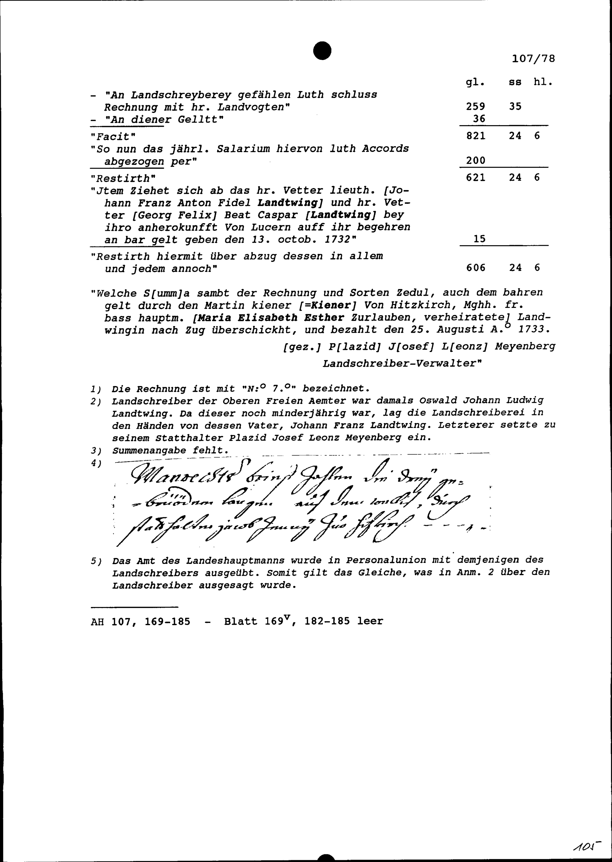 Rechnung der Landschreiberei der Oberen Freien Ämter vom 24. Juni 1732 bis 24. Juni 1733 unter Leonz Anton Weber, Landvogt der Oberen Freien Ämter und Stadt- und Amtrat Zug, erstellt von Plazid Josef Leonz Meyenberg, Landschreiberstatthalter