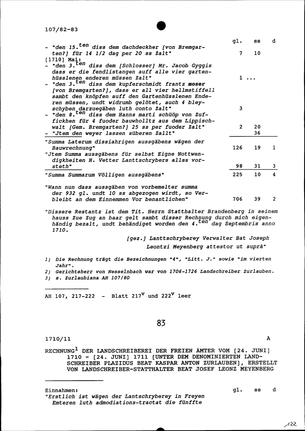 Rechnung der Landschreiberei der Freien Ämter vom 24. Juni 1710 bis 24. Juni 1711 unter Plazidus Beat Kaspar Anton Zurlauben, Landschreiber, erstellt von Beat Josef Leonz Meyenberg, Landschreiberstatthalter
