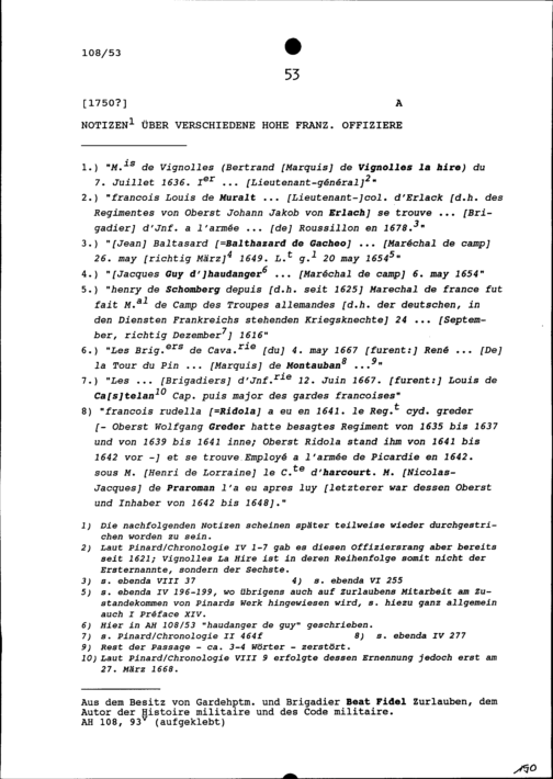 Notiz von Beat Fidel Zurlauben, Gardehauptmann und Brigadier, über verschiedene Hohe französische Offiziere