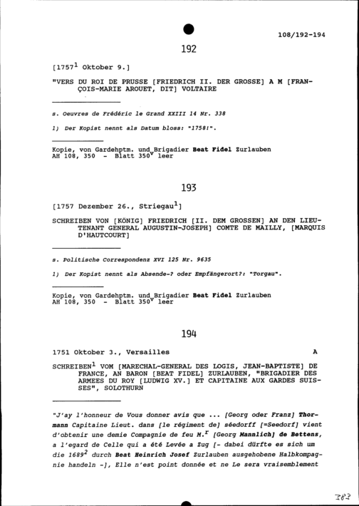 Gedicht von Friedrich II., der Grosse, König der Preussen, für François-Marie Arouet, genannt Voltaire